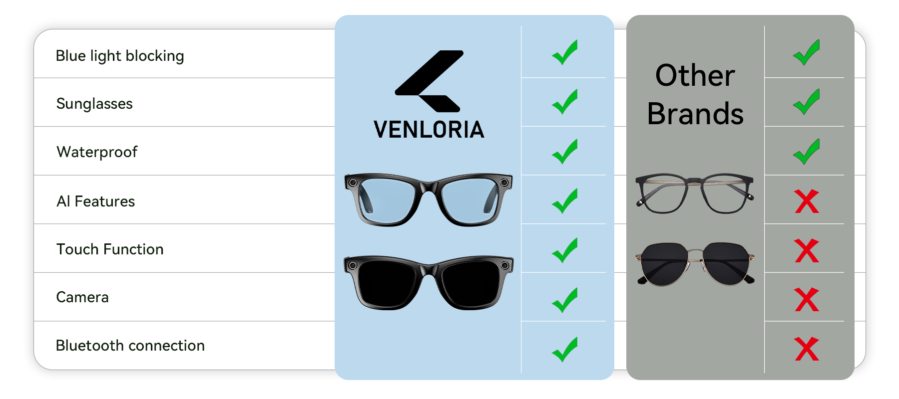 Drive safely, stay connected. Venloria smart glasses let you easily take calls while driving, without distraction.With Bluetooth connectivity, you can answer incoming calls with a simple tap on the temple, keeping your hands on the wheel and your eyes on the road. Every call is clear, safe, and effortless.